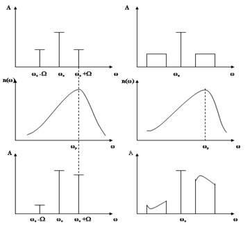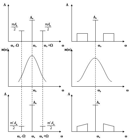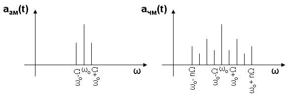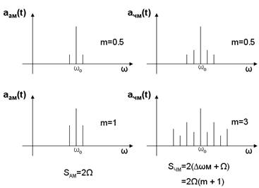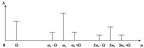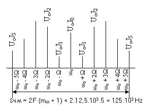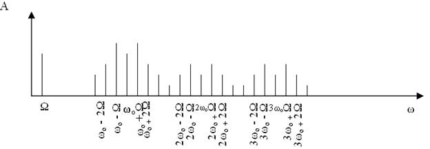 на честотата на носещия сигнал ωо ) и амплитуди Aon и съставки с честоти (nωо ± Ω ) и амплитуди mAon /2.Освен тези хармоници спектърът съдържа и една съставка с честотата на